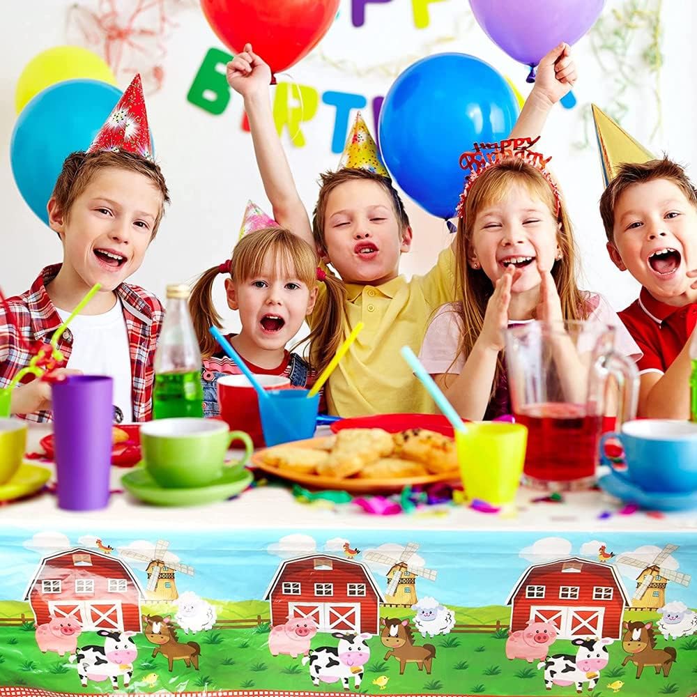 The farm animals party table cloth is designed with farm house, red barn and field in the background, cute farm animals like pigs, cows, sheep, horses, chicken, dogs, rabbits seem to leap on your table, light up your party and perfectly match with the farm animal theme, your ideal choice for farm animals party!Specifications:Material: plastic Size: 180 x 108 cm/ 70 x 43 inchColor: as pictures shown Quantity: 3 packsPackage included: 3pcs x farm animals party tableclothAll of them are made of high quality, sturdy plastic, super easy to wipe out and reusable.We are always offering nice, decorative tablecloths, which is A must to celebrate your parties!Last but not least, you can also use it as backdrop for party photography too!Warm notices: Manual measurement, please allow slight errors on size. The color may exist slight difference due to different screen display. Any plastic will produce harmful substances by burning in the air(Above 380℃)please stay away from fire.