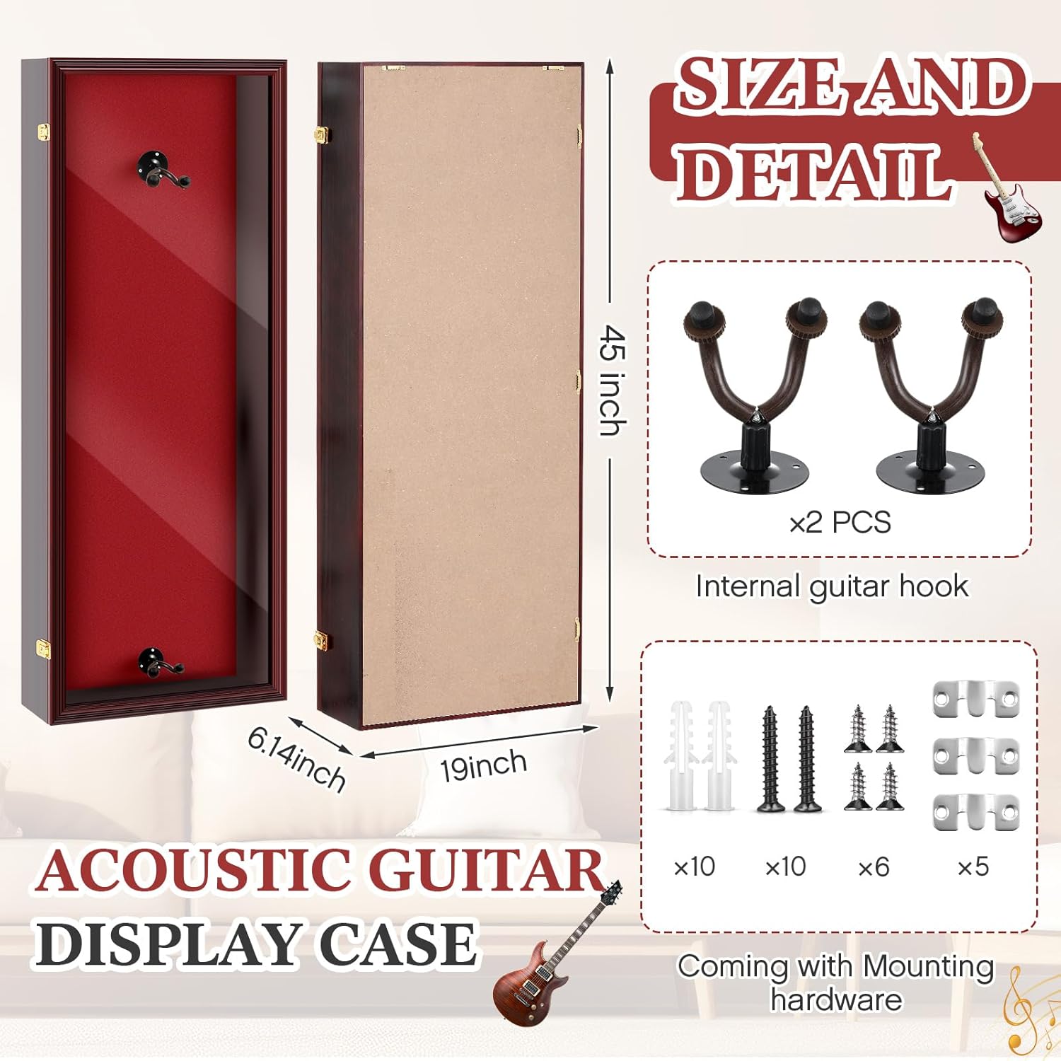 Features: The surface of this acrylic acoustic guitar display box has been sanded many times to achieve a fine smoothness. The exterior is a vintage red-brown color frame, and the interior uses a felt interior background (red felt), which has a beautiful display effect. This display case for guitar collection accommodates most acoustic and electric guitars, providing ample display space for your instruments. Whether you are an experienced musician or an amateur, you can confidently display your treasured collection. Specifications: Material: wood, acrylic Color: red brown Size: The outer dimensions: about 45 x 19 x 6.14 inches The inner dimensions: about 43.82 x 17.72 x 4.96 inches Package includes: 1 x Large guitar display case Notes: Manual measurement, please allow slight errors on size. The color may exist a slight difference due to different screen displays