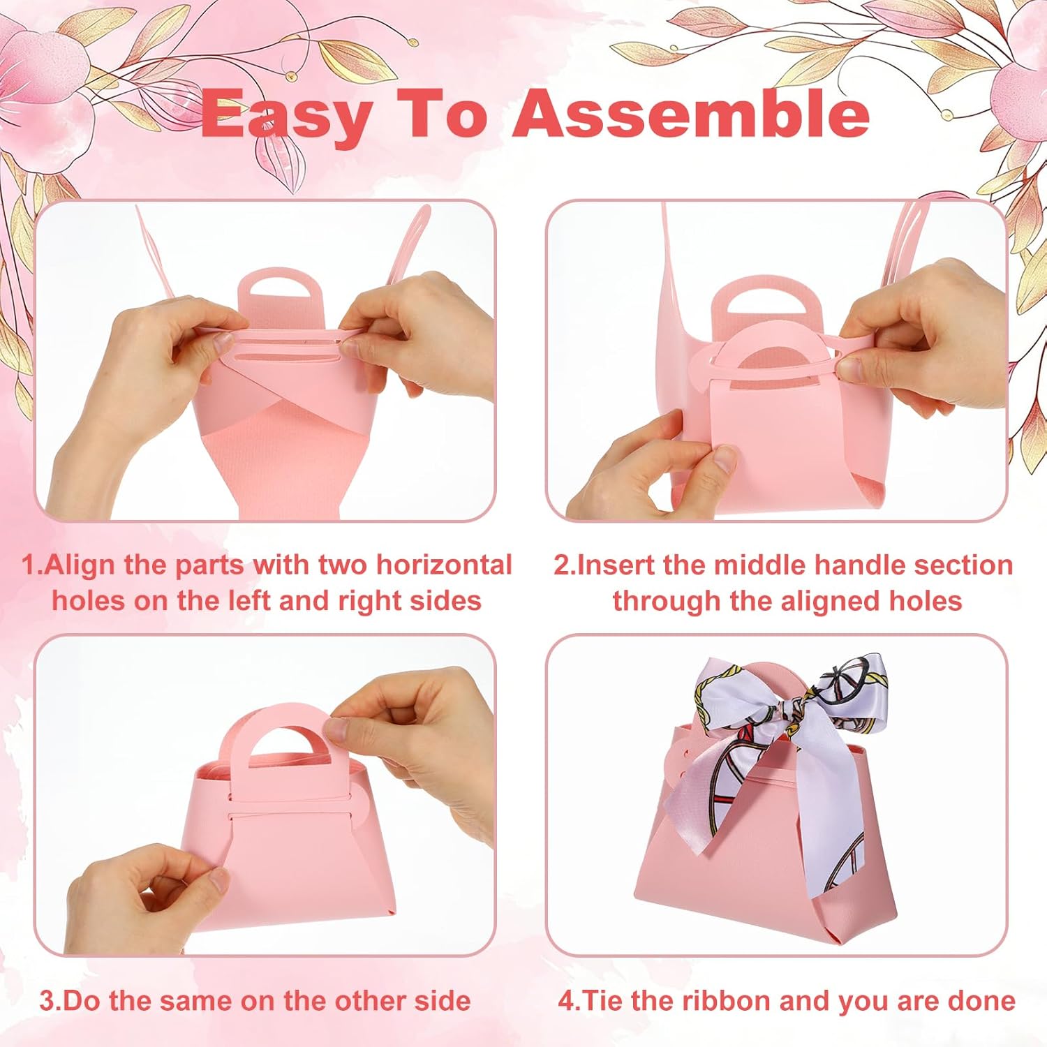 Welcome to our store!Features:Easy to Assemble: Our candy boxes are incredibly easy to assemble, requiring no tape or glue. Simply fold along the pre-pressed creases to easily create a beautiful and sturdy box to fill with delicious candies. Our PU leather gift bags are not only easy to clean but also durable and reusable, ensuring multiple uses.Wide Application: Our versatile leather candy bags add an elegant and sophisticated touch to your party favors. These candy bags are suitable for various occasions such as parties, birthday parties, weddings, Christmas, Easter, or Halloween, and can be personalized to your liking. Furthermore, these candy bags make a unique and special gift choice, appropriate for any occasion.Specifications:Material: PUColor: PinkSize: 4.72 x 5.12 x 2.2 inchesSuitable for: Baby Showers Birthday Wedding CandyPackage Includes:36 Pcs x PU Leather Purse Gift Bags with HandlesNotes:Manual measurement, please allow slight errors on size.The color may exist a slight difference due to different screen displays.
