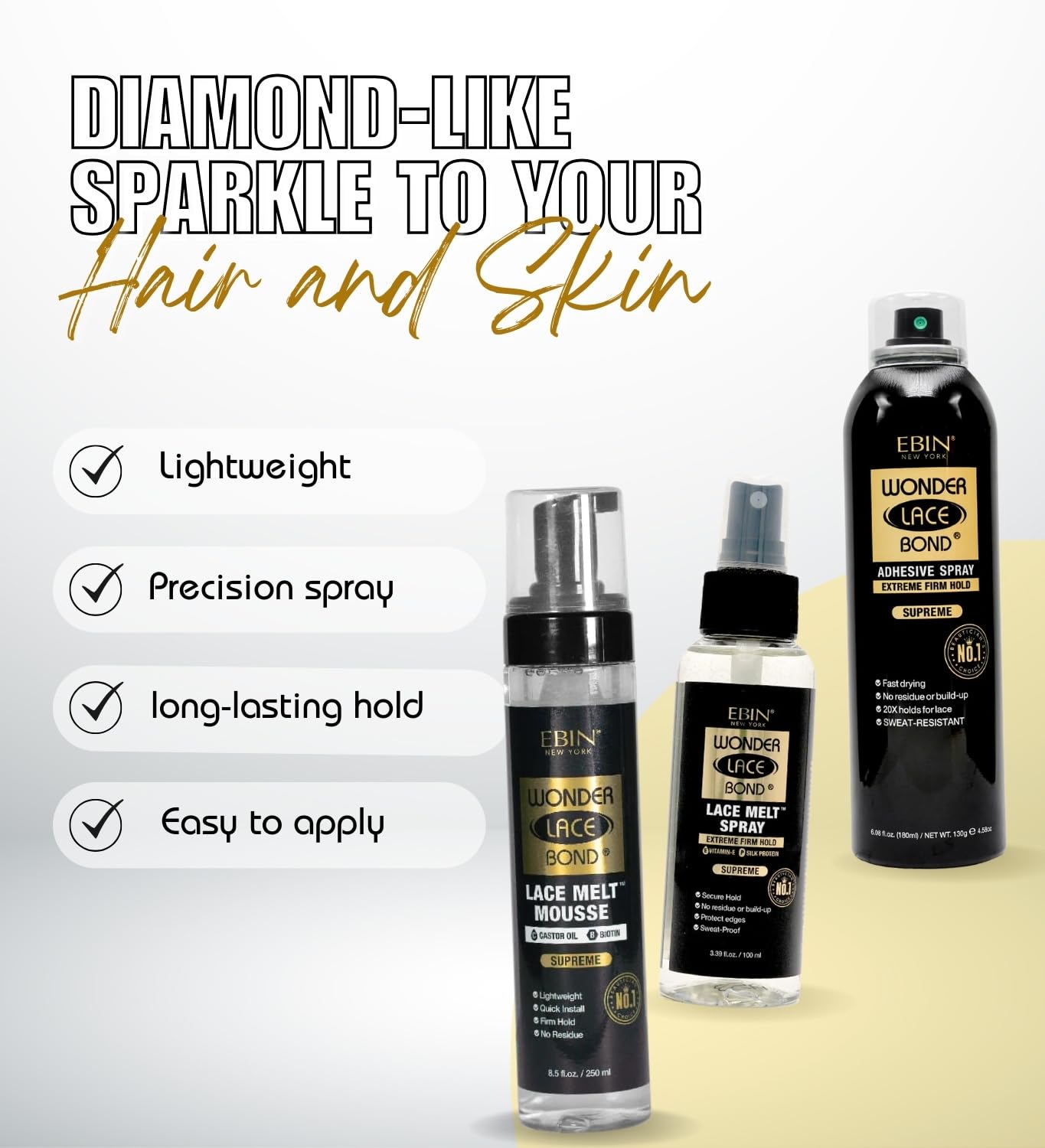 EBIN NEW YORK Wonder Lace Bond Melt Mousse 8.5 oz Bundle with Melting Spray 3.39 oz and Adhesive Spray 6.08oz Firm Hold Lace Wig Sprays, Seamless Wig Application โ€“ Gift Set (3 Items)