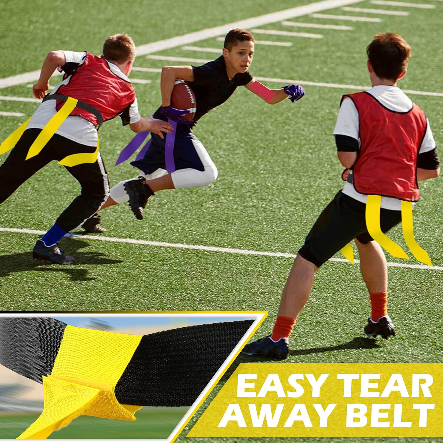 Flag Football Belts are suitable for use as kids flag football equipment and as an adult flag football set. Comprised of 19pcs 45" long adjustable football belts and 57pcs yellow tags. Tags use hook and loop fastener for easy attachment and removal. Theses flag football sets can be suitable for off season training, can also be applied for a variety of games, such as hide and seek, pick up games, capture the flag, beach fun and more.