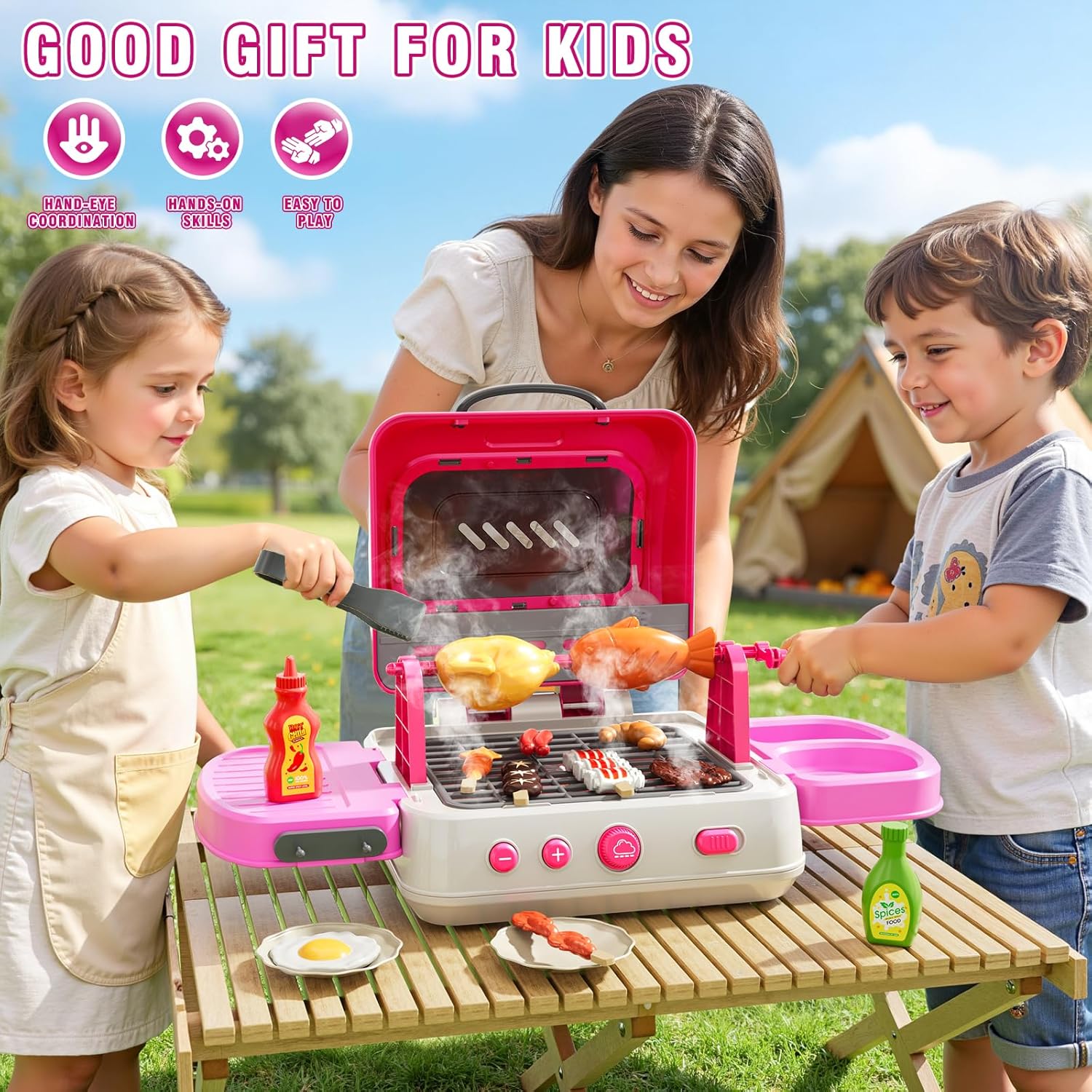 Kids Kitchen Playset: This play kitchen set (18.50*11.41*11.81in). BBQ grill set with toy grill, tongs, pretend food. Cooking toy with smoke, lights, sounds. Let kids enjoyment and simulate real grill. Play Kitchen Set for kids age 4-8