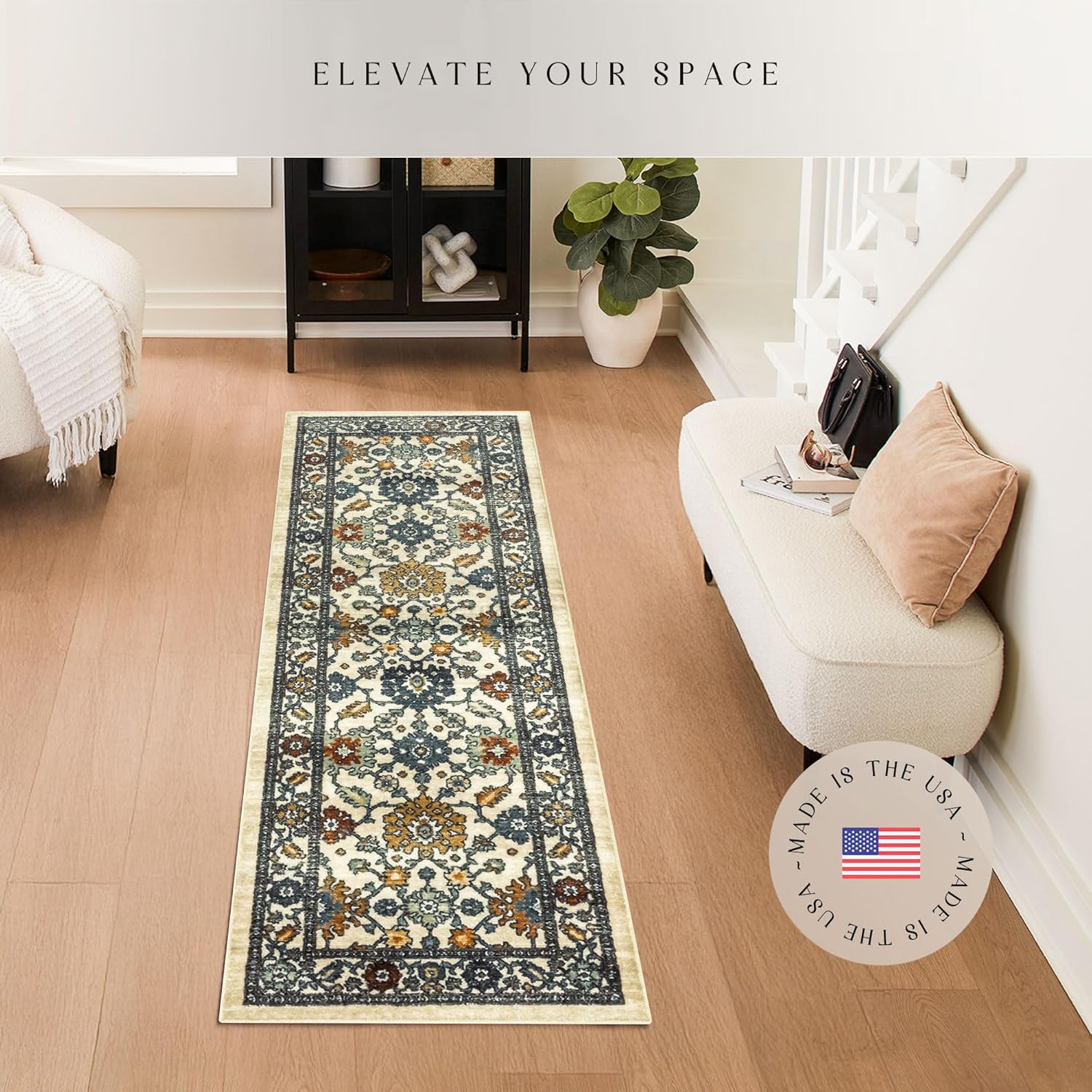 Enhance your living space with this traditional oriental design rug, featuring a tan background complemented by blue and rust accents. Crafted from durable polyester, this rug not only adds a touch of elegance but also ensures longevity and easy maintenance. The non-skid latex backing provides stability, making it a perfect choice for high-traffic areas while keeping your floors safe and stylish.