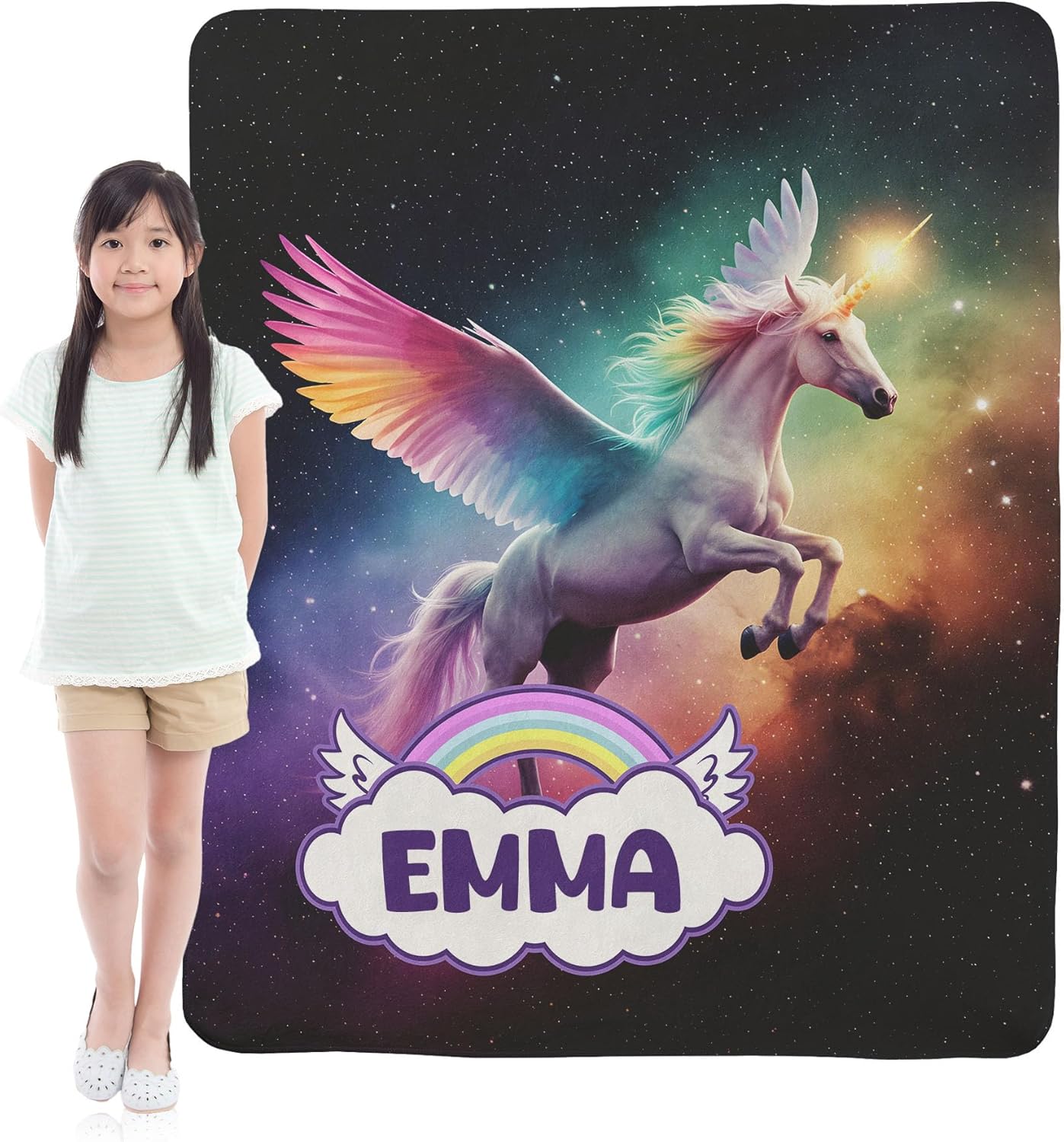 Create a magical bedtime experience with our customizable unicorn themed fleece blanket. Perfect for girls, teens, and anyone who loves unicorns, this ultra-soft blanket features whimsical unicorn designs that add a dreamy, enchanted touch to any space. Whether you choose a customized name blanket or one of our non-personalized unicorn patterns, this cozy sherpa fleece throw is a gift they'll treasure forever. Made from high-quality fleece with a warm sherpa backing, this lightweight yet cozy blanket is perfect for snuggling, reading, movie nights, or adding a pop of unicorn magic to a bedroom or nursery. The soft and plush texture makes it a comforting companion for chilly nights, road trips, or just lounging around the house. Available in two sizes, 50"x60" and 60"x80", this unicorn blanket is the perfect fit for a child’s bed, a cozy throw for the couch, or a larger option for teens and adults who love a bit of extra warmth. This personalized unicorn blanket makes an unforgettable birthday, Christmas, or special occasion gift for girls of all ages. Whether it’s for a daughter, granddaughter, niece, or best friend, they’ll love wrapping up in this soft, magical throw. Choose from eight stunning designs, including dreamy pastel rainbows, majestic galaxy unicorns, and playful fairytale castles, ensuring there’s a perfect style for every unicorn lover.Designed for everyday use, this blanket is machine washable and fade-resistant, ensuring it stays vibrant and soft even after multiple washes. Bring the magic of unicorns into your home and give a truly special, one-of-a-kind gift with this personalized unicorn themed fleece blanket today.