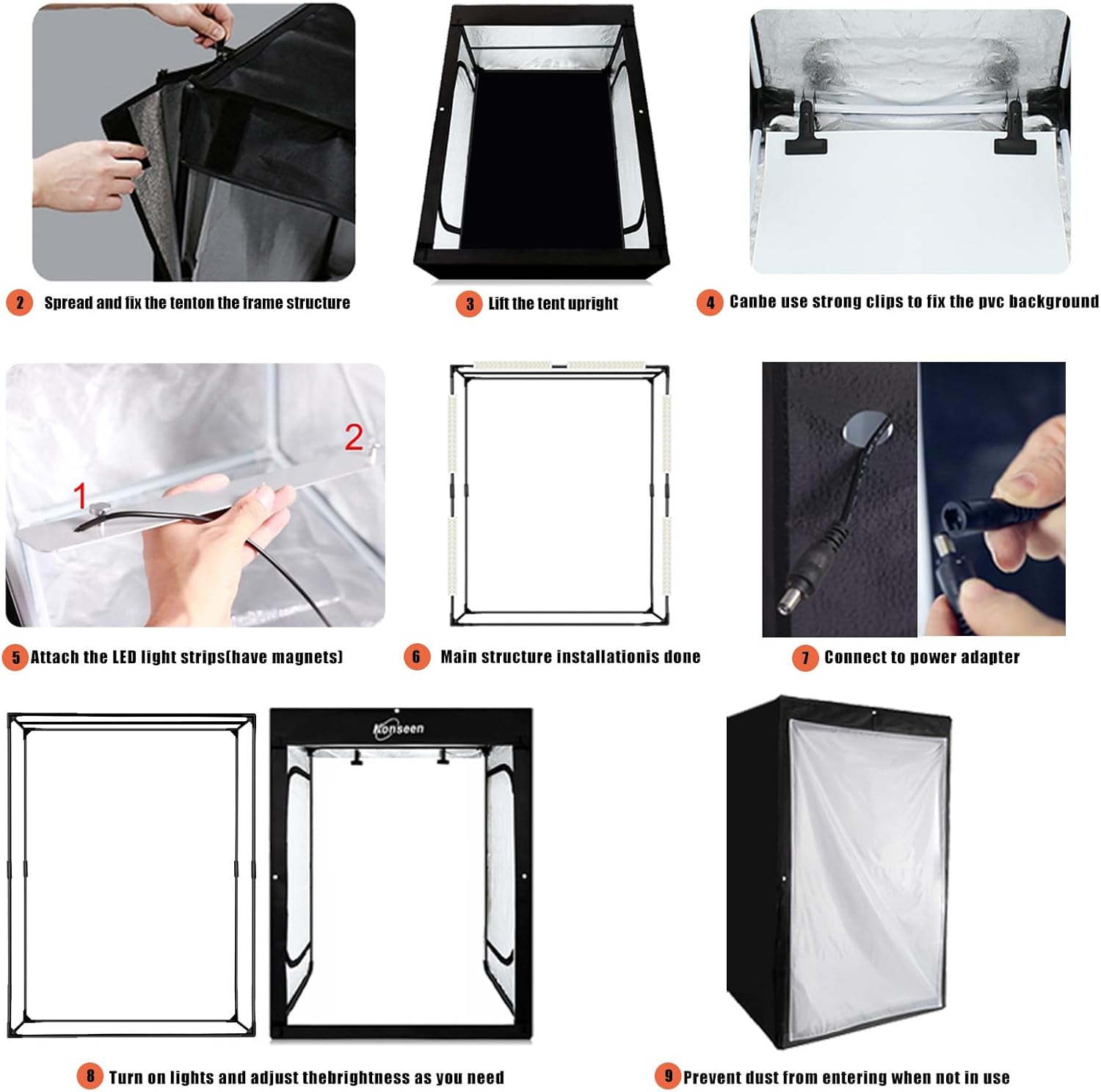 | BuiltIn Media | 16x Metal Rods,all inside the PVC background (Because of the problem of the production batch, there are two colors of black or white ), 1x Shed body cover (47x20x55inch/120*50*140cm), 3x PVC Background(Black/White/Blue),2x Clamps, 2x Hook, 6x LED Light board (96 LEDs each),3x AC Dimmable adapter, 9x Three way adapter,3x Soft cloth |