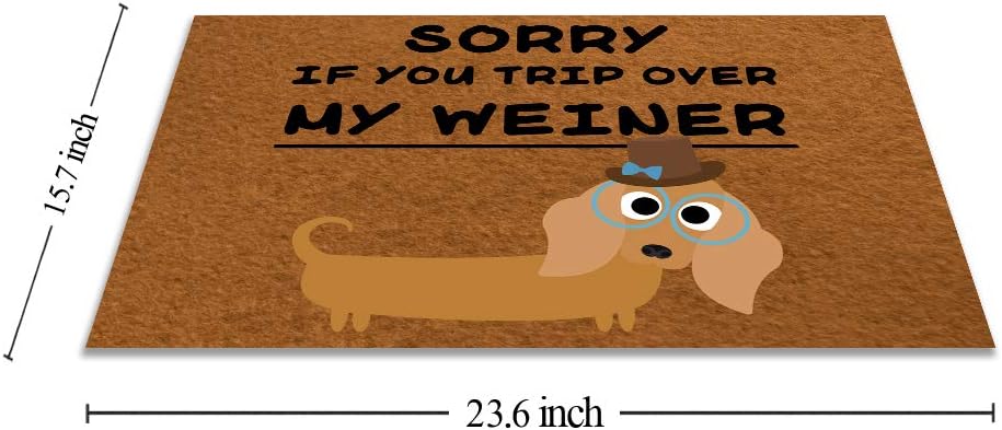 Sorry If You Trip Over My Weiner*Size: 23.6(L) x 15.6(W) Inches *Material: The back is a dispensing print and the front is felt (slighter hair). durable and non slip doormat*Features: Easy wash, washable / hand wash, washing with ordinary temperature, DO NOT washing with hot water.Hang to dry. Washing separately to avoid staining. * Funny design decorate your room, make fun for your family and friends*NOTE: Our doormat is a soft material. During the mailing process, we will fold the package. When it is received, there will be creases in the middle, but please rest assured that the crease is temporary. After you use it, the crease will disappear automatically. You want to make the crease disappear quickly, you can take the method of pressing/cleaning/footing.*Purchase: Please order at the So Hot store.So Hot Funny Doormat Custom Indoor DoormatArrivals Departures 18X30 InchHome and Office Decorative Entry Rug Garden/Kitchen/Bedroom Mat Non-Slip Rubber15.6X23.6 InchHome and Office Decorative Entry Rug Garden/Kitchen/Bedroom Mat Non-Slip Rubber