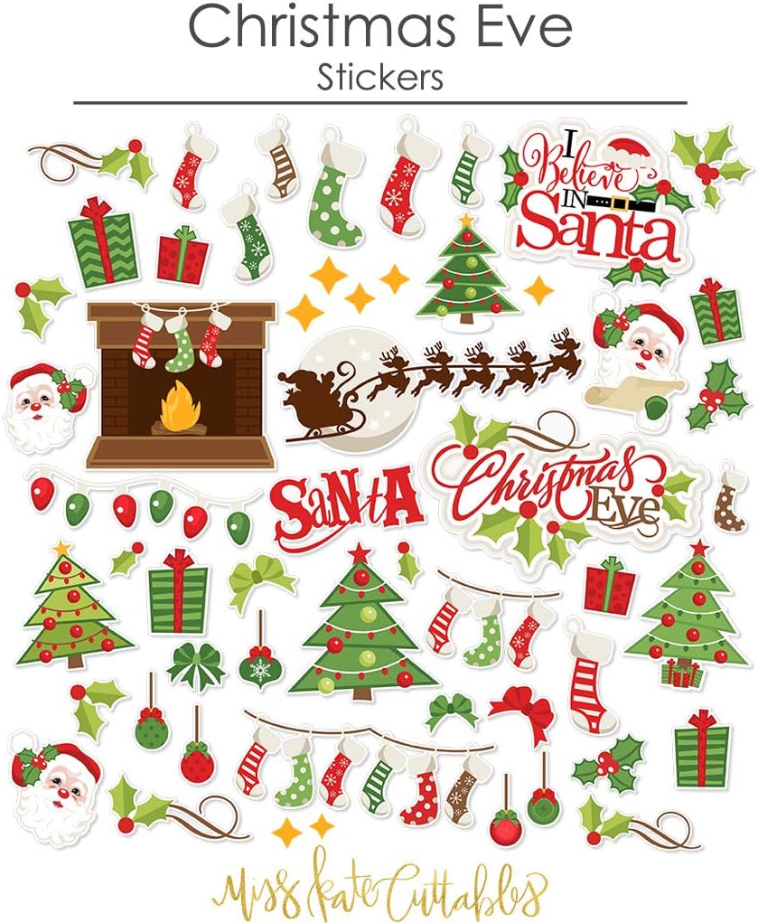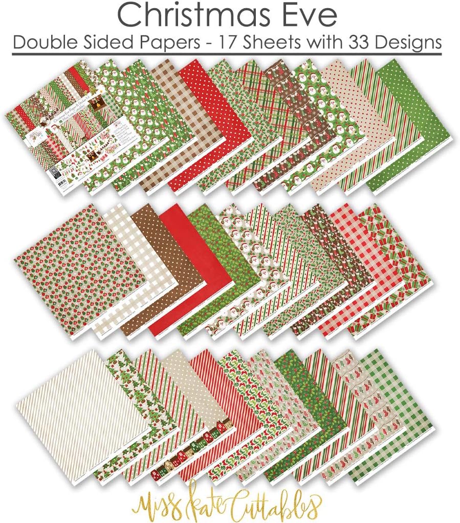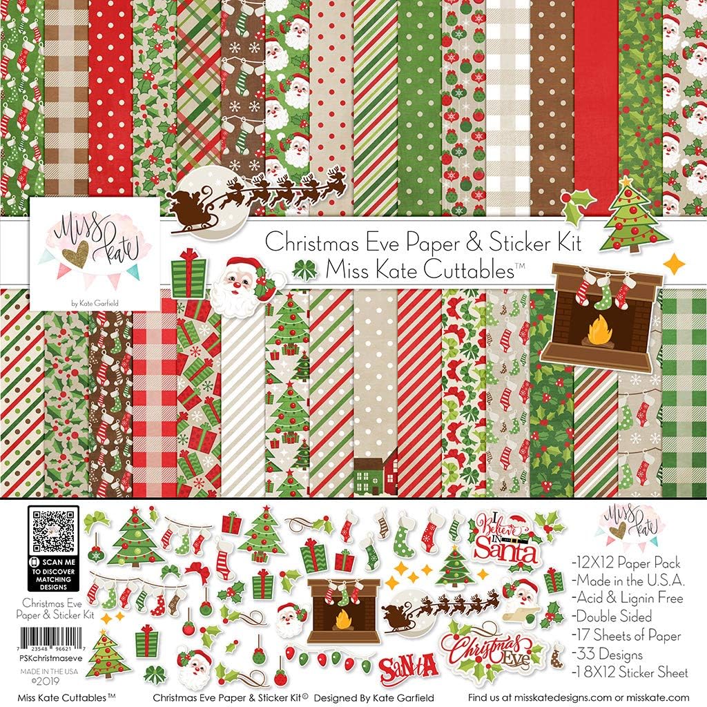 Miss Kate's Paper & Sticker Kit For Scrapbookers, Card Makers, & CraftersAre you always on the lookout for new supplies with cute designs?Then look no further because we’ve got you covered!The Miss Kate Cuttables Paper & Sticker Kit is exactly what you need!About Out PaperWe get lots of questions and comments about the type of paper Kate chooses to print Miss Kate's paper on.Our Bristol sheets provide a stiff, strong surface to work on that is silky smooth to the touch. It is not cardstock and it is not thin paper. The printing has a slight gloss to give it some dimension. We love our paper and think you will too!Paper & Sticker Kit DescriptionThe Christmas Eve Paper has a wide variety of Patterns including Polka Dots, Stripes, Plaid, Santa Claus, Snow, Holly Berry, Christmas Morning Stockings, Christmas Presents, Christmas Tree, Snowflakes, Candy Canes, Sugar Cookies, Treats, Houses, Christmas Ornaments, Bows, Red, Green, and Tan.The Christmas Eve Sticker Sheet has a wide variety of designs, including "I Believe in Santa" "Santa" "Christmas Eve" Titles, Santa Claus, Holly Berry, Santa checking his list, Strings of Stockings, Fireplace, Presents, Tree, Snowflakes, Houses, Santa flying Sleigh with Reindeer, Strings of Ornaments, Bows.THEME: Works with Decorating for Family Christmas Eve Party Holidays Santa Claus December 24th 25th Night Before Christmas Jolly old Elf Cookies for Santa Treats Gingerbread Candy Cane Frosting.✔ 80lb Premium Specialty Paper✔ 17 - 12"x12" sheets of DOUBLE-SIDED paper✔ 33 Designs✔ 1 - 8"x12" Sticker Sheet✔ Acid and Lignin Free (our paper will NOT damage other things)✔ Archival Quality (beautiful colorful prints that will never fade)