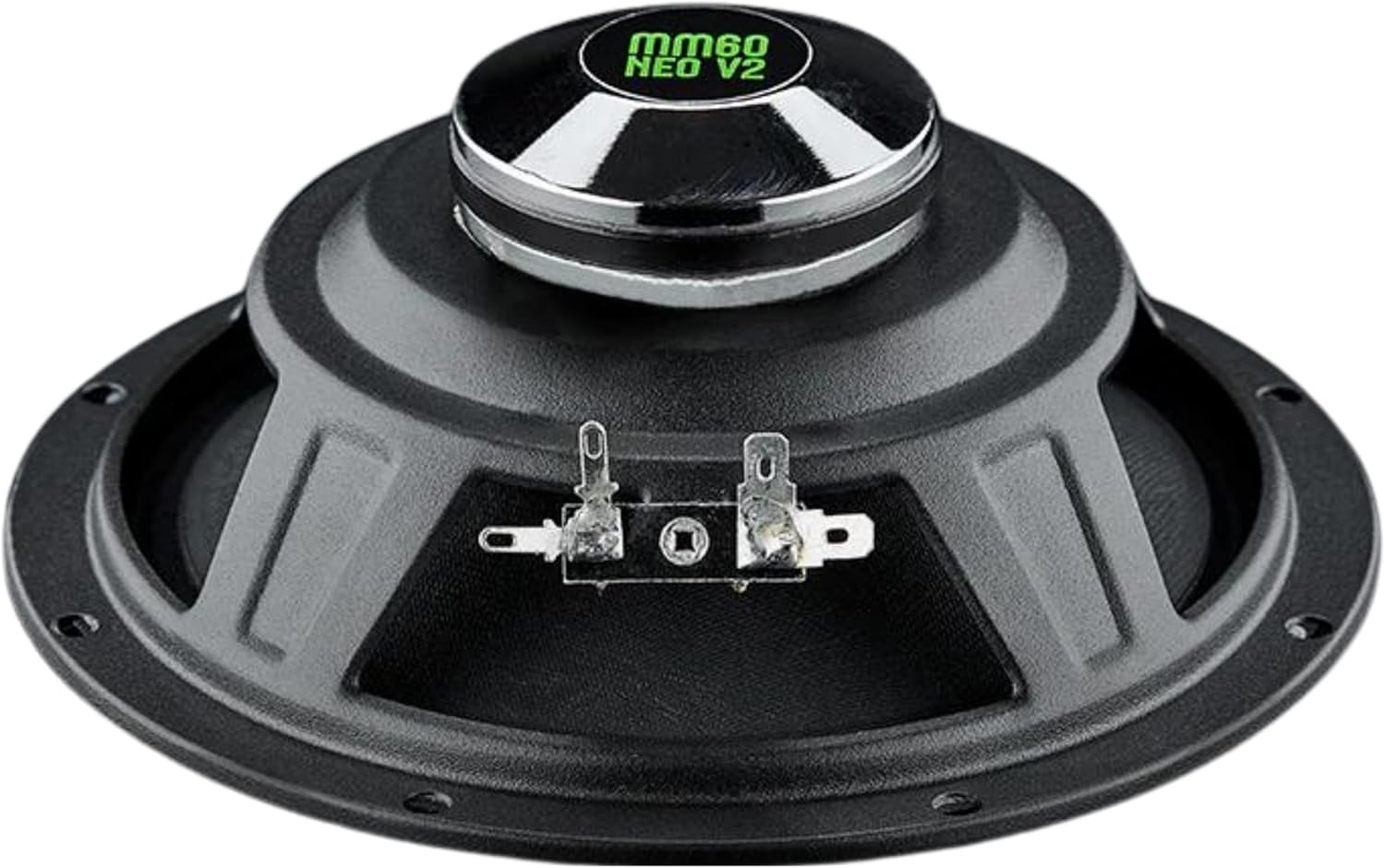 Pair of Deaf Bonce 6.5" Mid-Range Speakers 100W 4 Ohm Machete Black MM-60NEO v2This Listing Includes:(2) Deaf Bonce 6.5" Midrange Speakers MM-60NEOSpecifications Per Speaker:Nominal Diameter: 6.5"Nominal Impedance: 4 OhmMAX Power Handling: 200 WattsRMS Power Handling: 100 WattsSensitivity (1w/1m): 95dBFrequency Response: 110Hz ~ 13KHzMotor:Voice Coil Diameter: 1"Winding Material: CopperCone Material: Pressed PaperSurround Material: ClothBasket Material: Stamped SteelMagnet Material: NeodymiumThiele & Small Parameters:Equivalent Volume: Vas - 6.4LFree Air Resonance: Fs - 120HzTotal Factor: Qts - 0.924Force Factor: BL - 5.6Dimensions Per SpeakerOverall Diameter: 6.59" (167.5mm)Front Mount Baffle Cutout: 5.63" (143mm)Mounting Depth: 2.44" (62.2mm)Overall Depth: 2.71" (69mm)